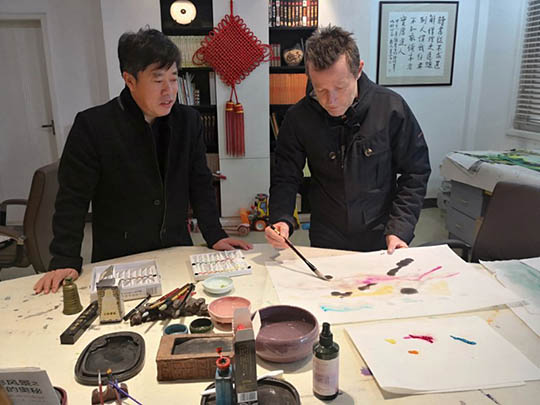 當代藝術(shù)的杰出代表、瑞士巴塞爾著(zhù)名藝術(shù)家chris先生,也是首次來(lái)到中國,用他的話(huà)說(shuō),來(lái)到了三圣就有回家的感覺(jué),一切是那么的自然、美好。他欣然在三圣畫(huà)室創(chuàng )作兩幅作品留念。