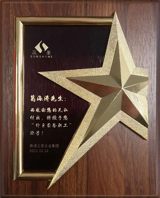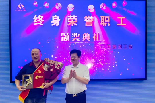 三圣奮斗史中閃耀著(zhù)這樣一顆璀璨之星,他以堅定的信念和不懈的努力,登上榮譽(yù)巔峰,成為開(kāi)發(fā)區當之無(wú)愧的一名“金牌員工”,并被三圣集團董事會(huì )、三圣工會(huì )授予“終身榮譽(yù)職工”的光榮稱(chēng)號。